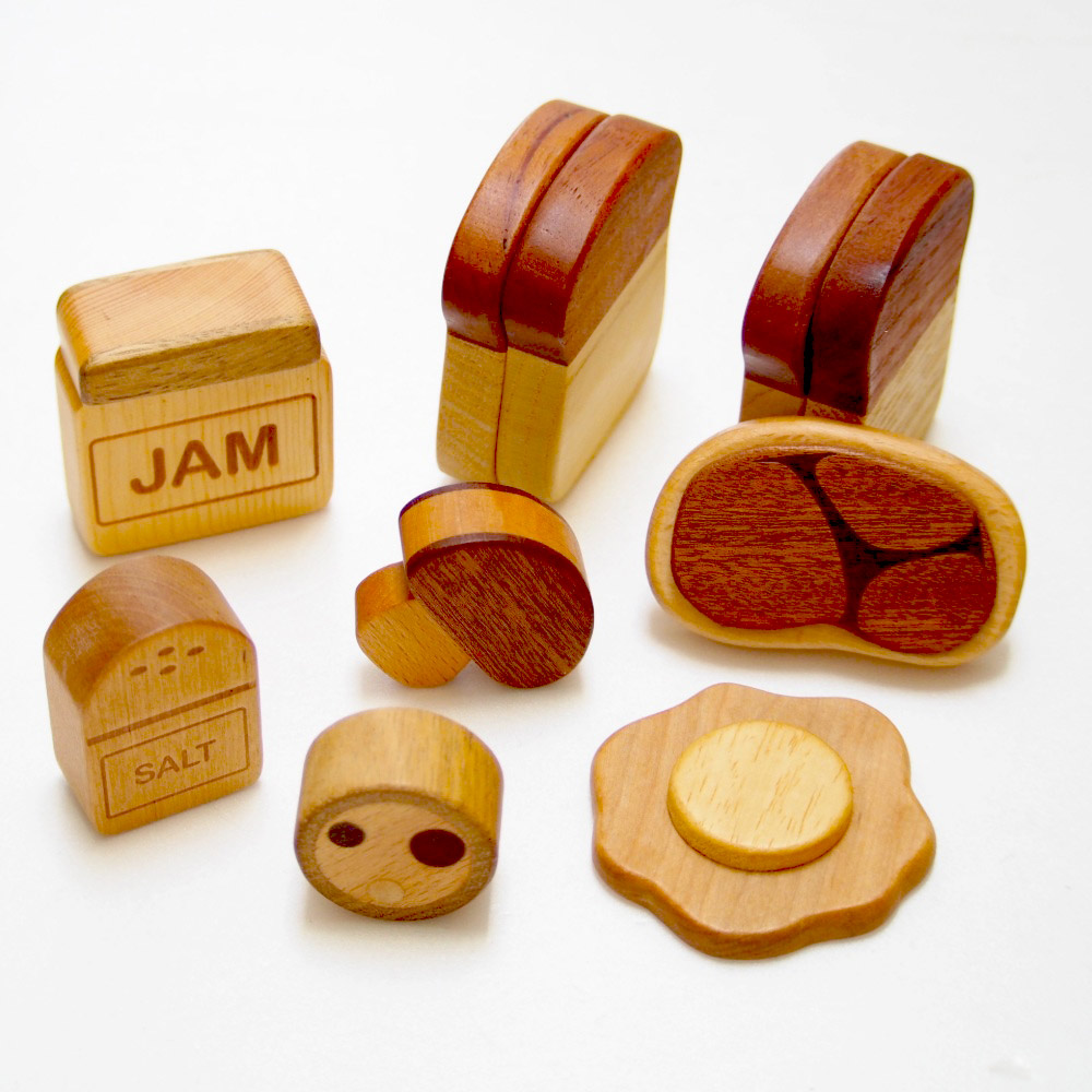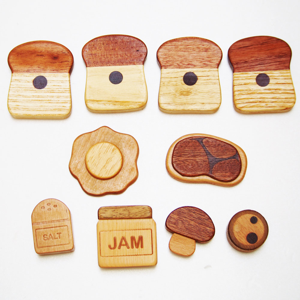内容:食パン4枚(磁石入り2枚セットを2個)、目玉焼き、ステーキ肉、マッシュルーム、のり巻き、ジャム、塩 各1個